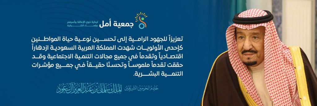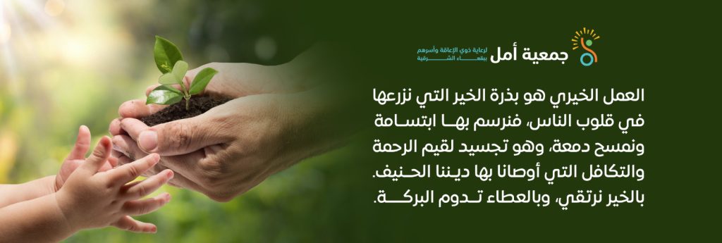 تركز الجمعية على تقديم الدعم والرعاية لذوي الاعاقة واسرهم وتهدف الى تحسين جودة حياتهم من خلال توفير خدمات متعددة نشمل الرعاية الصحية , والتأهيل النفسي والبدني ,وتعزيز التوعية المجتمعية حول قضايا الاعاقة لتسهيل اندماج ذوي الاعاقة في المجتمع ,ومساهمتهم بشكل فعال ومميز .